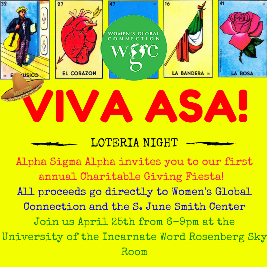 The first annual Loteria event held by the ASA sorority. The event is to be held at the Incarnate Word Rosenberg Sky Room. All proceeds go to the Women’s Global Connection Future Leaders San Antonio/ Girls Global Summit Program and the S.June Smith Center.